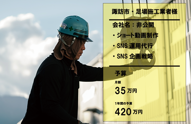 諏訪市に拠点を置く足場施工業者様に対し、TFCではショート動画制作とSNS運用代行を組み合わせたプレミアムプラン(月額35万円)を導入しました。9か月間の運用でフォロワー数は4,800人を突破、総再生回数は1,200万回を超え、日本全国でもトップクラスの知名度を持つ足場施工業者へと成長。さらに、新規求人応募4件、新規顧客2件の獲得につながりました。